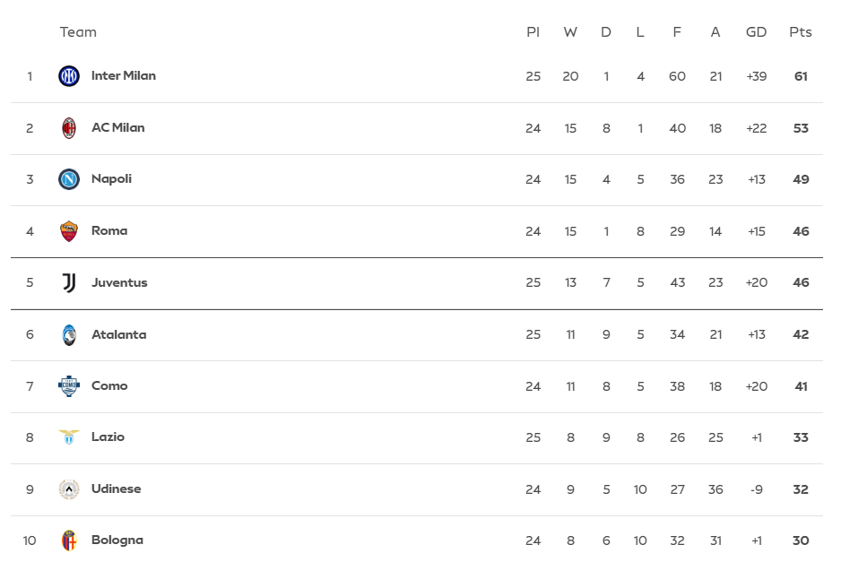 Back-to-back league wins have strengthened their grip on third place. While mathematically still in the title conversation, the Milan clubs remain the primary Scudetto contenders.
